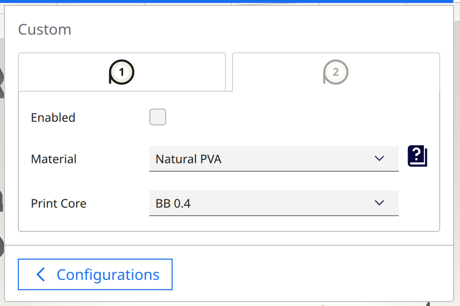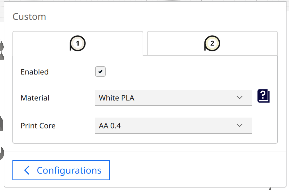- We use 0.4 nuzzles at the moment, so you will need to set Print Core to be AA 0.4 for material 1, and BB 0.4 for material 2, uncheck the material 2 box in Cura.