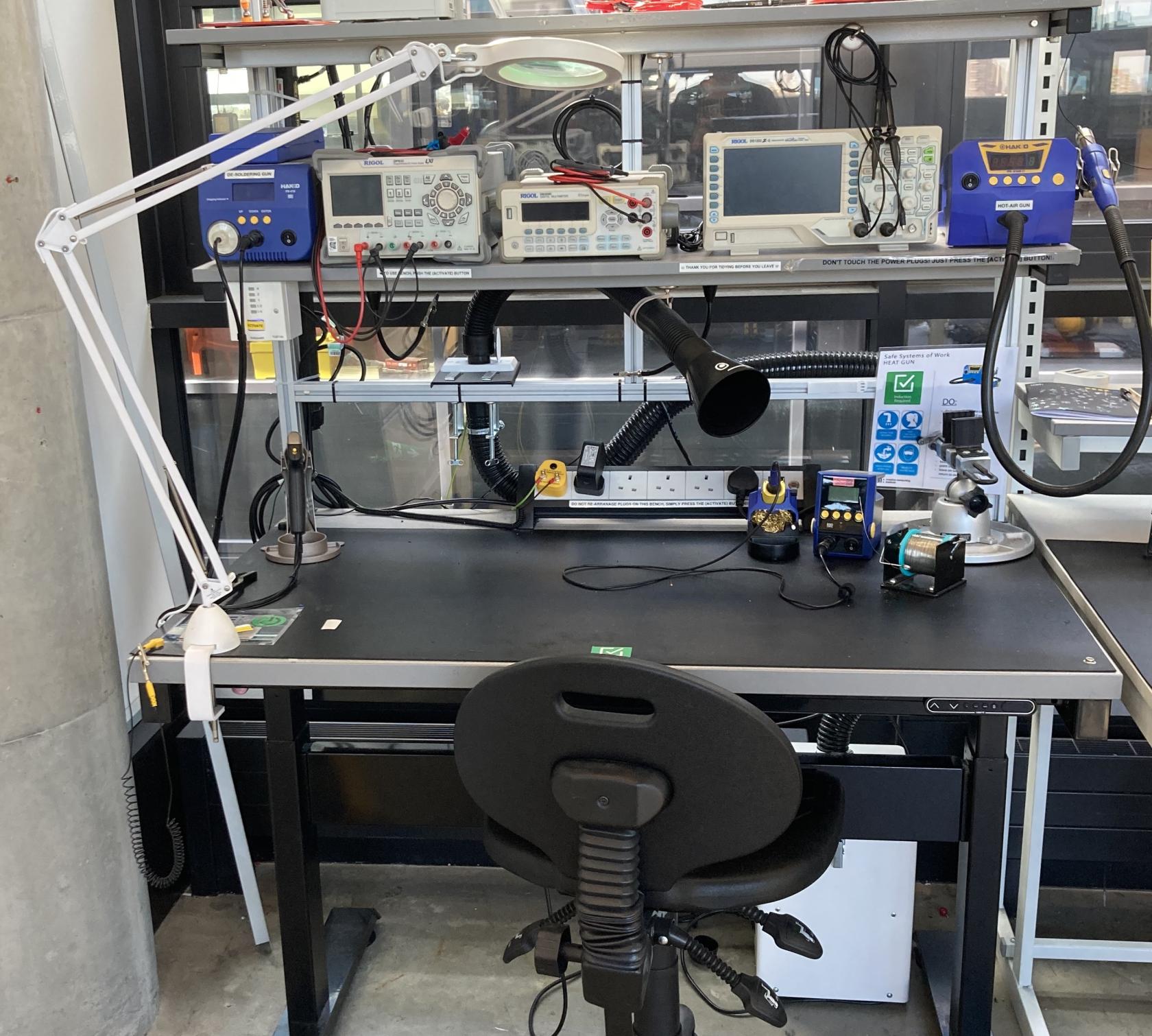 This bench intended for work on more advanced circuits, such as audio and radio signal circuits, or circuits that require extensive reworking. Please only use this bench if you need either to use the specialist equipment (oscilloscope, desoldering gun), or if you need to use a height-adjustable bench.
