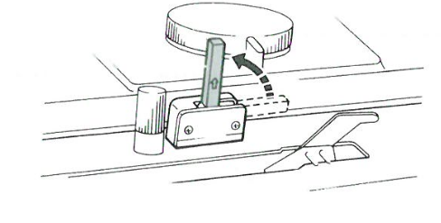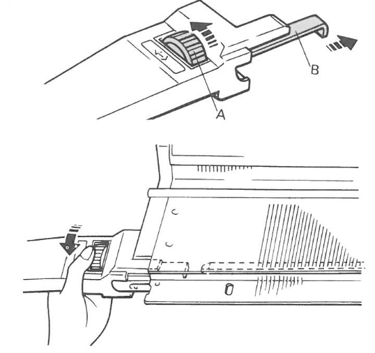 - Loosen the Securing wheel "A" on the yarn changer as much as it will go then insert the Securing Plate "B" into the guide hole of the sponge bar on the left hand side. Turn the securing wheel "A" to tighten it, making sure it is flush with the side of the machine.