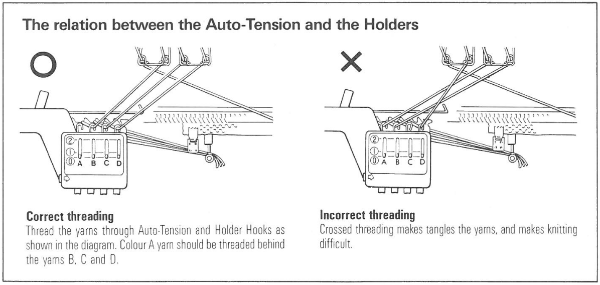 - Sometimes, when switching over the yarns, they can get tangled in the yarn feeder on the carriage. It is good practice to check each time you switch that they have fully swapped over