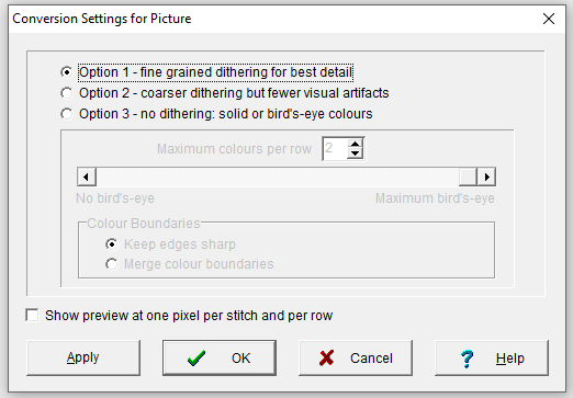 There are three options here; fine-grained dithering, coarser dithering, and no dithering. Different options will work best for different types of images. Have a play around and see which gives you the best result. When trying them out, select 'Apply' rather than 'Ok' as this will allow you to change between each option without having to go all the way back to the beginning of the wizard.