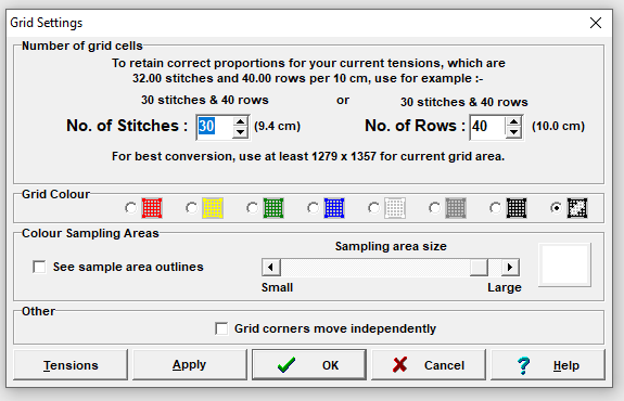 The next pop up determines the grid settings. Here you can set the number of stitches and rows you want the design to have. When you enter in a specific number of stitches (or rows), the text above the box will tell you the corresponding number of rows (or stitches) to keep the dimensions of your graphic the same. Most of the time you will set the number of stitches then enter in the corresponding row value it gives you.