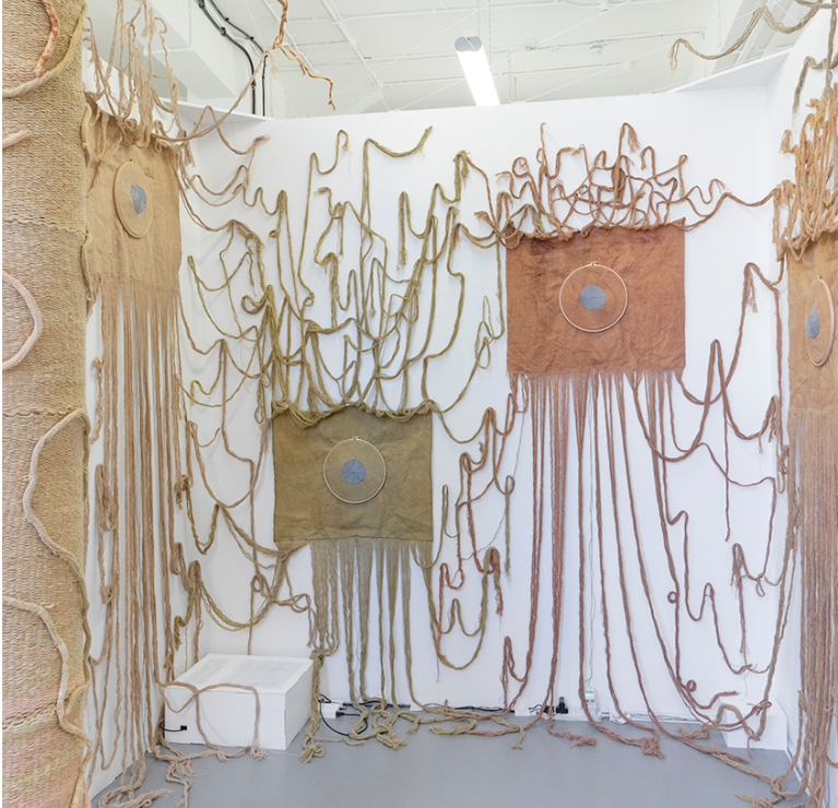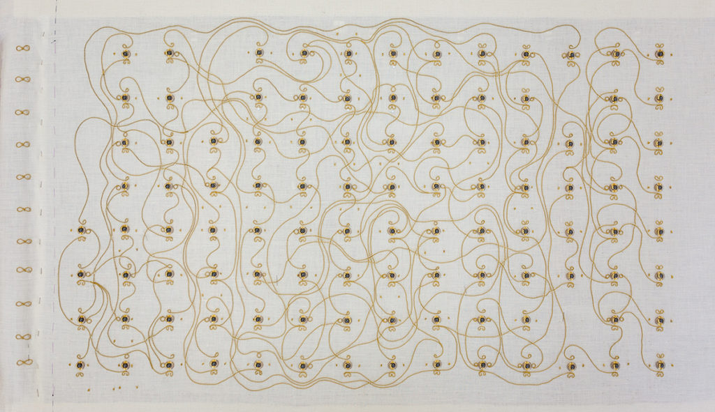 Technically, the piece consists of (textile) relays, similar to early computers before the invention of semiconductors. Visually, the gold materials, here used for their conductive properties, arranged into specific patterns to fulfill electronic functions, dominate the work. Traditionally purely decorative, their pattern here defines they function. They lay bare core digital routines usually hidden in black boxes. Users are invited to interact with the piece in programming the textile to compute for them.