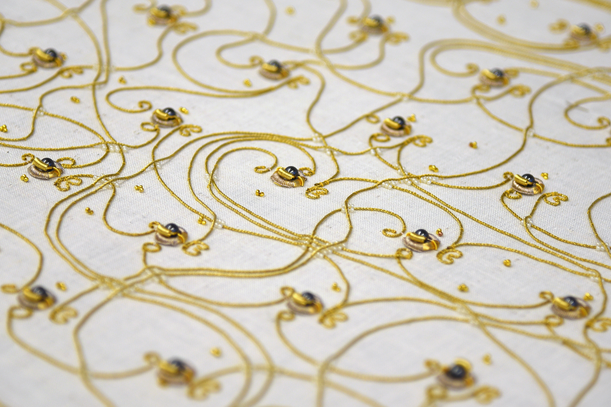 The Embroidered Computer is an exploration into using historic gold embroidery materials and knowledge to craft a programmable 8 bit computer. Solely built from a variety of metal threads, magnetic, glas and metal beads, and being inspired by traditional crafting routines and patterns, the piece questions the appearance of current digital and electronic technologies surrounding us, as well as our interaction with them.