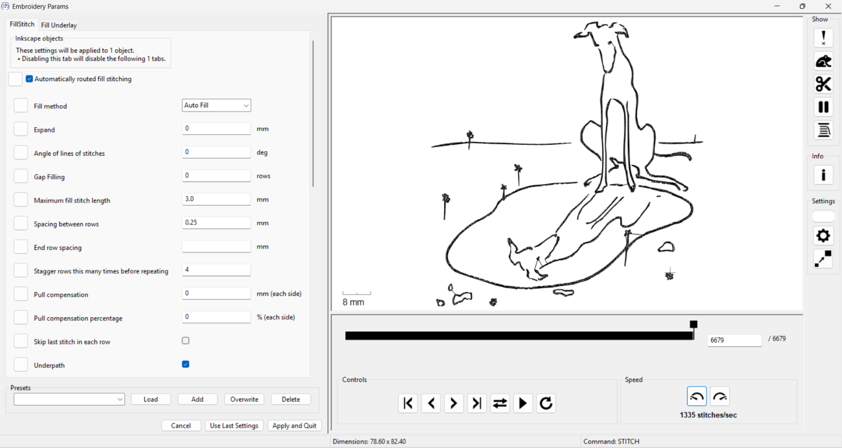 Here you can change the parameters such as stitch length, density, and fill type. Once you are happy, click Apply and Quit. This will take you back to Inkscape. It will seem like nothing has changed, however you can now export the file as a .pes and embroider it!