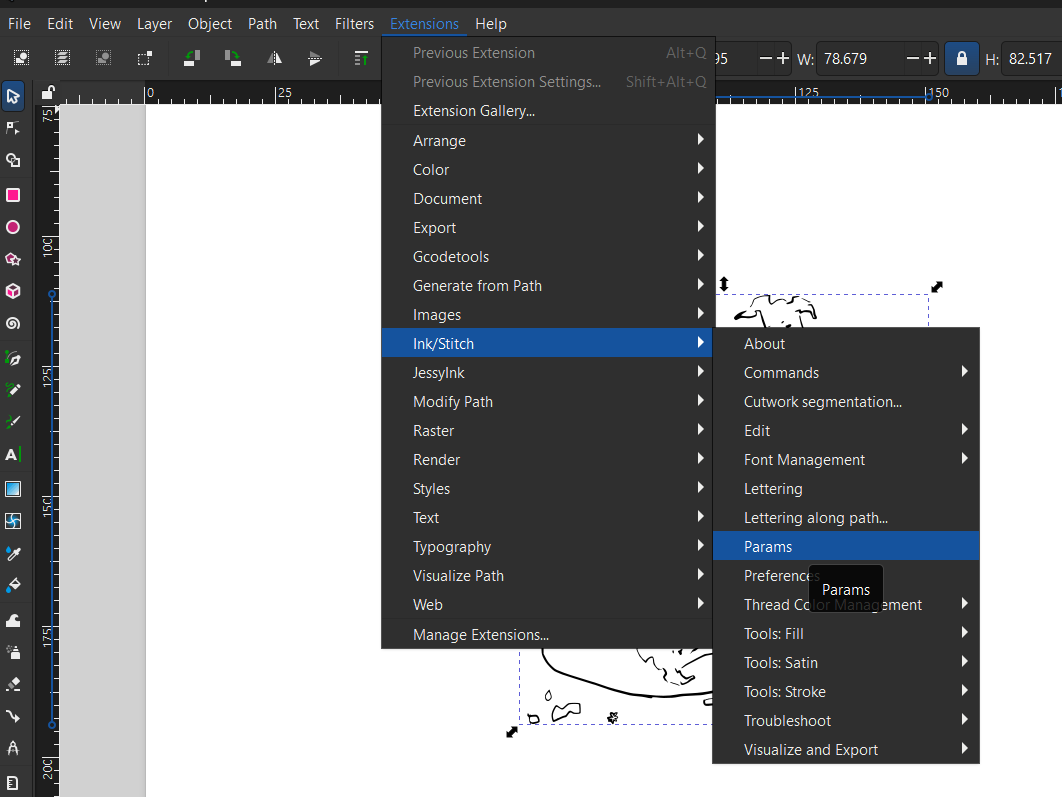 Once you have your vector image, go to Extension > Ink/Stitch > Params.