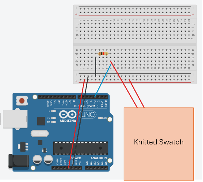 We can then measure the output voltage between the two resistors. If we know the value of one resistor and the voltage being applied across both, we can determine the value of the other resistor. Therefore, if we have a variable resistor (like a conductive knitted swatch), this can be used towe measure the change in resistance.