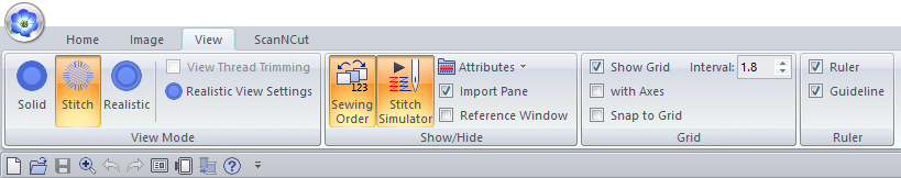 Under this tab you can change view options such as the preview mode. You can also add features such as a grid and can toggle whether the design snaps to it. This can be very useful when drawing the design yourself within the program.