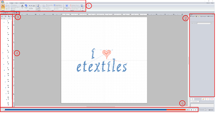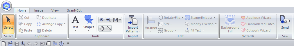 Under the home tab you will find options for creating text and drawing simple shapes and lines. On the far right you will also have the option to send your file directly to the embroidery machine from this computer.
