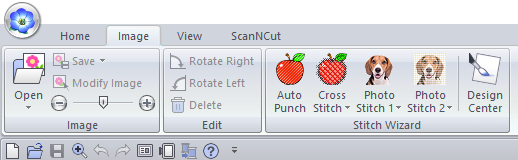Under this tab you will find options for converting images into embroidery patterns. First import your image using the Open button the select one of the 'Stitich Wizard' modes. There are 5 differnt methods to choose from: