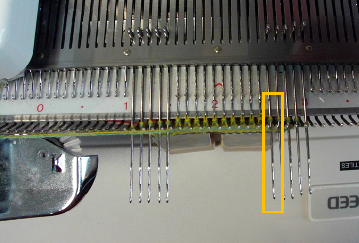 This increase can only be done on the opposite side of the working section to the carriage. In the image below, the highlighted needle is the first one that could be increased along with any other consecutive needles to the right of it.