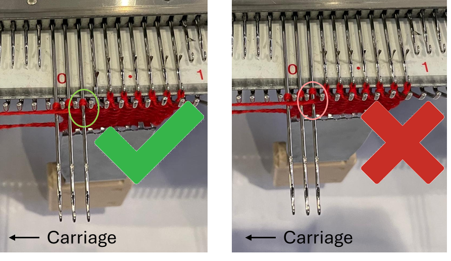 To increase the number of working needles, we need to bring them back into B position. The process for this changes slightly depending on the knitting method that you are using.