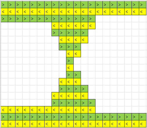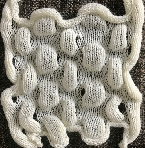To make short rowed bumps, decrease by one needle each row on alternating sides. The below image shows an example of how this would be knit. The different coloured rows show the direction of the carriages movement.