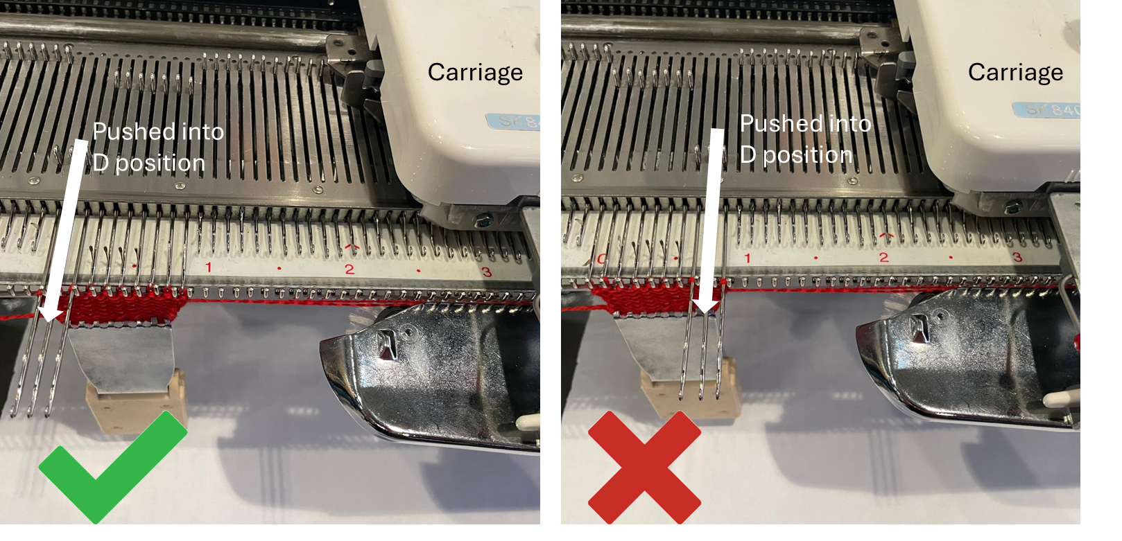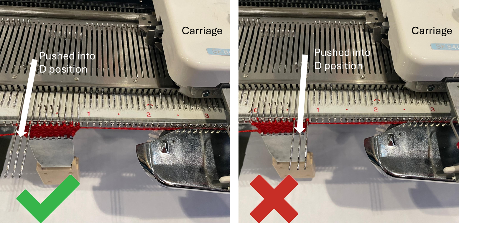 - Push needles to be decreasing into D position (on the opposite side of the carriage)