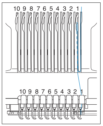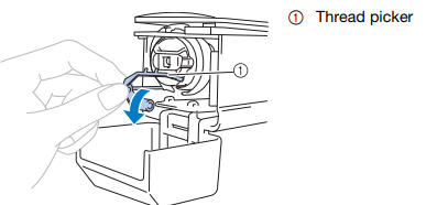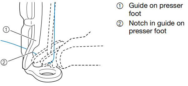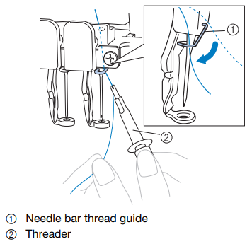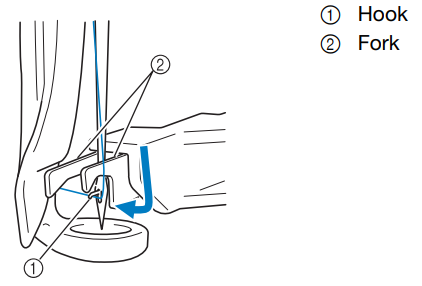 - As seen in the illustration below, pass the thread under the fork of the automatic needle threading mechanism from the right, and then catch the thread with the hook that passes through the eye of the needle.
