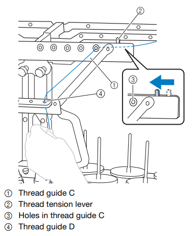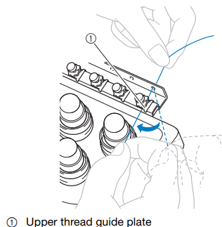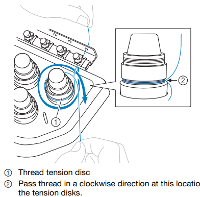 Each thread has its own tension disk to be able to individually adjust the tensions. To thread it, wrap around once in a clockwise direction as shown by the arrows.