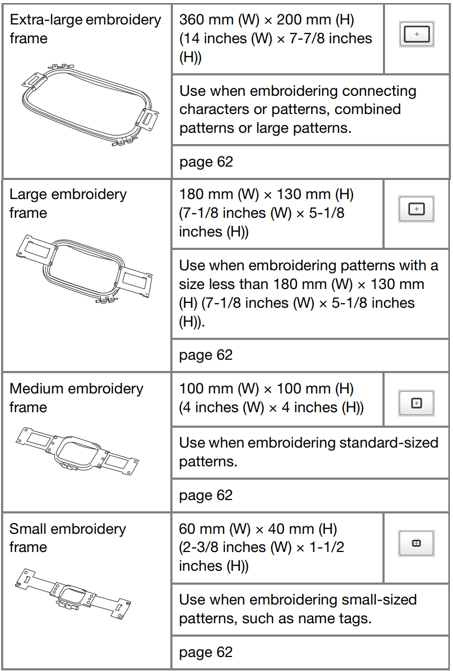 If you don't know what hoops you can use, the machine will tell you -- just look for the hoop icon in the top while browsing designs. Designs too big for the hoop will be greyed out and you will not be able to stitch with them. The machine knows what hoop you have mounted and will adjust this accordingly.
