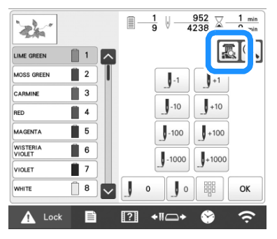 Enter the stitch counting menu (indicated below), then modify the stitch number using the needle icons. The machine's needle will move as you adjust, allowing you to see what's going on. Press the -/+ stitch button at the bottom to open up the menu.