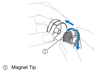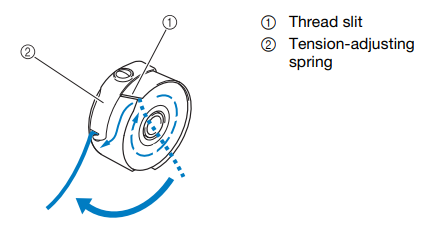 - IMPORTANT: is the bobbin the correct way round? -> when you replace the bobbin in the case, ensure that it matches the direction in the picture below. This is the root of almost all beginner problems, and gladly easily resolved.