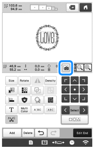 Aligning the design on your fabric properly is really important. This machine has a camera built in that can help you align your designs. On the edit page, press the camera button. This will take a scan of the fabric in the hoop and display an image of it underneath the design you have uploaded. You can then position your design precisely.