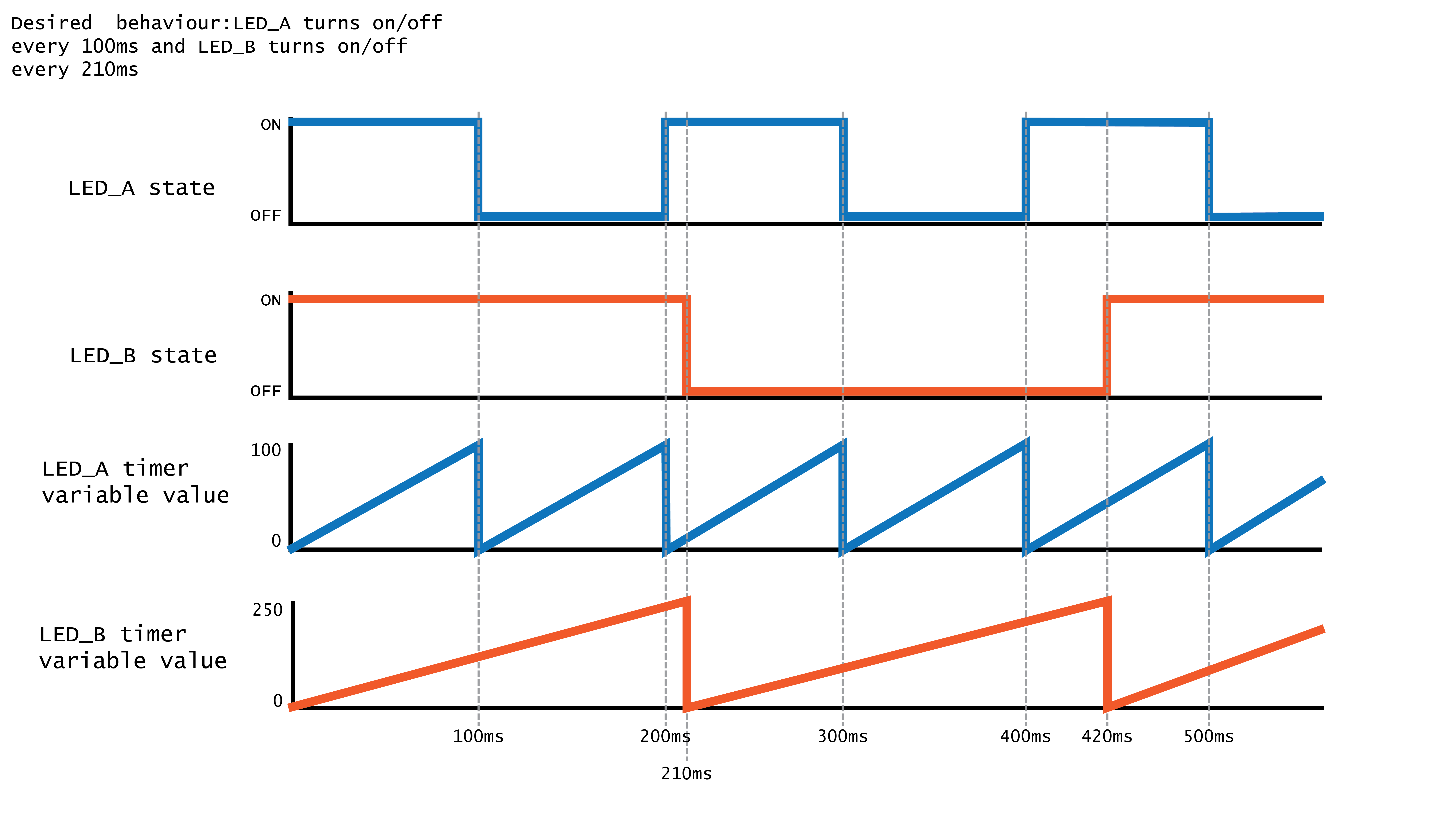 ifstatement, turn LED_A on and reset timer to 0. LED_B timer has not been reset so it continues increasing. - Next, LED_A timer once again reaches its target (100ms) so we catch that again, reset the timer and turn the LED off instead. Meanwhile, LED_B timer still hasn't reached its target so we keep going.