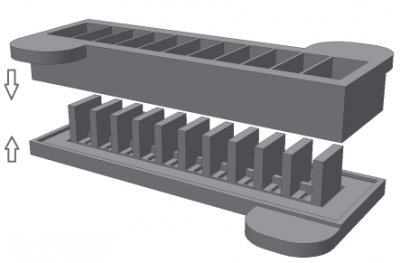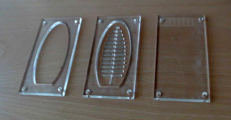 Each part of the mould requires a base plate, and then one or more layers to make up the volume of silicone. In the image below, you can see that one layer has the negative for the air pocket, and then there is a second layer to allow silicone to be poured over the top.