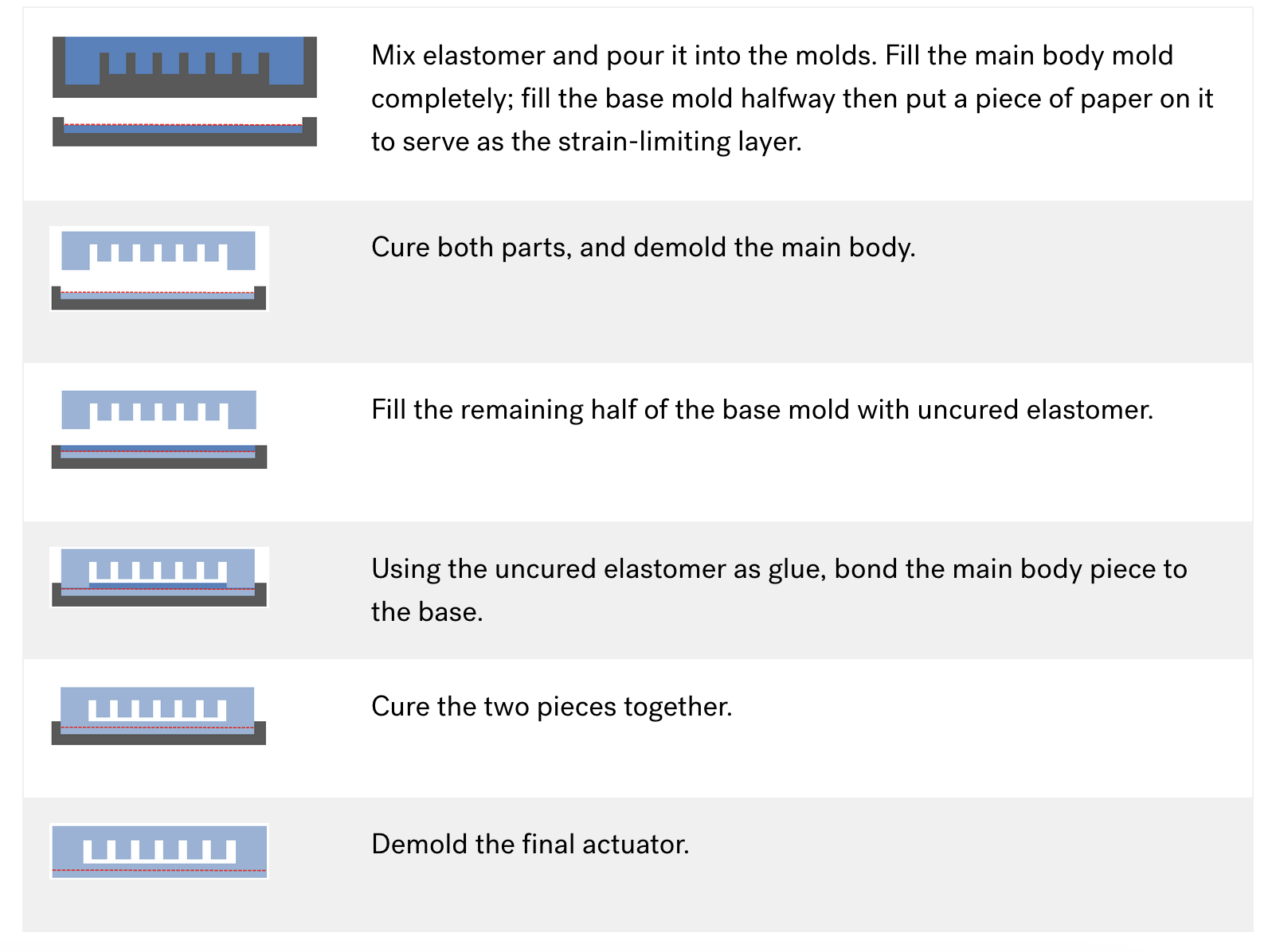 Here are the same steps as a visual guide, from the Whitesides Lab soft robotics guide.