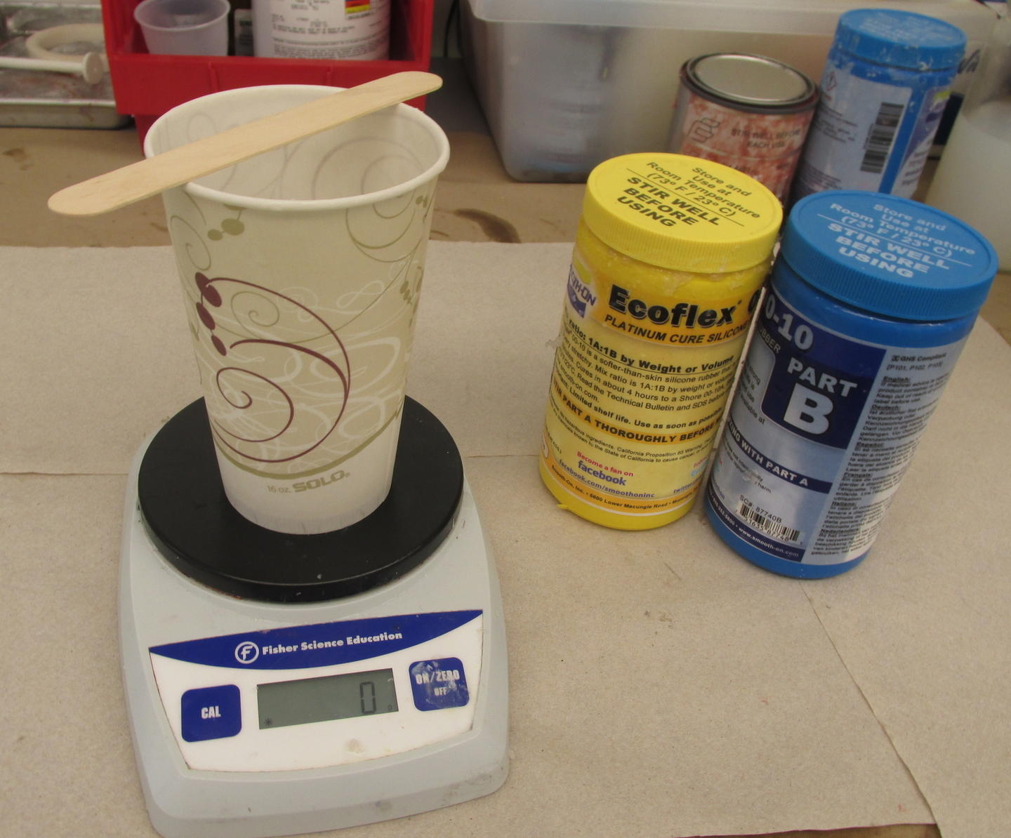 - Mix the Ecoflex. The casting silicones we stock in the CCI come as mixtures of 2 parts, which must be mixed together in a separate container (e.g. a plastic cup). First, place the cup on the scales and zero the scales. Then pour Ecoflex A to half the total volume that you will require. Take a note of the weight. Zero the scale again, and pour the same weight of Ecoflex B into the container. Mix thoroughly together for 3 minutes.